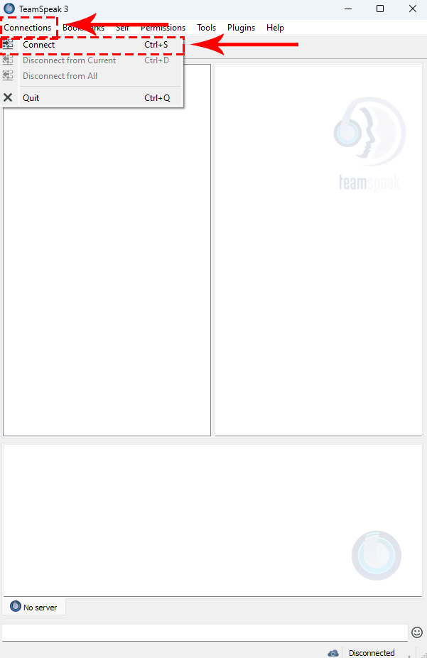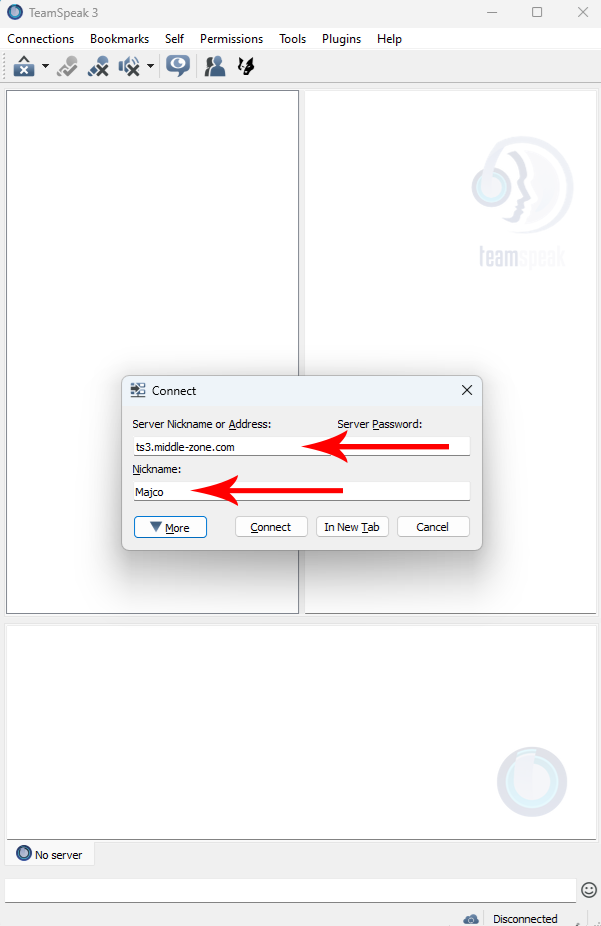 Základný spôsob pripojenia k serveru je cez záložku pripojenia v pravom hornom rohu klienta TeamSpeak 3.