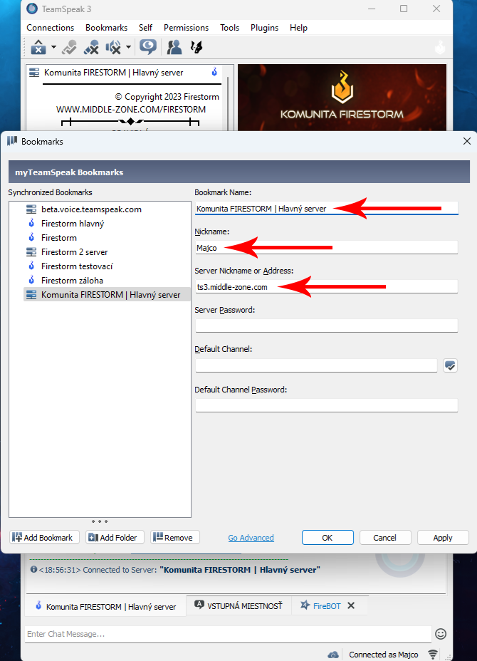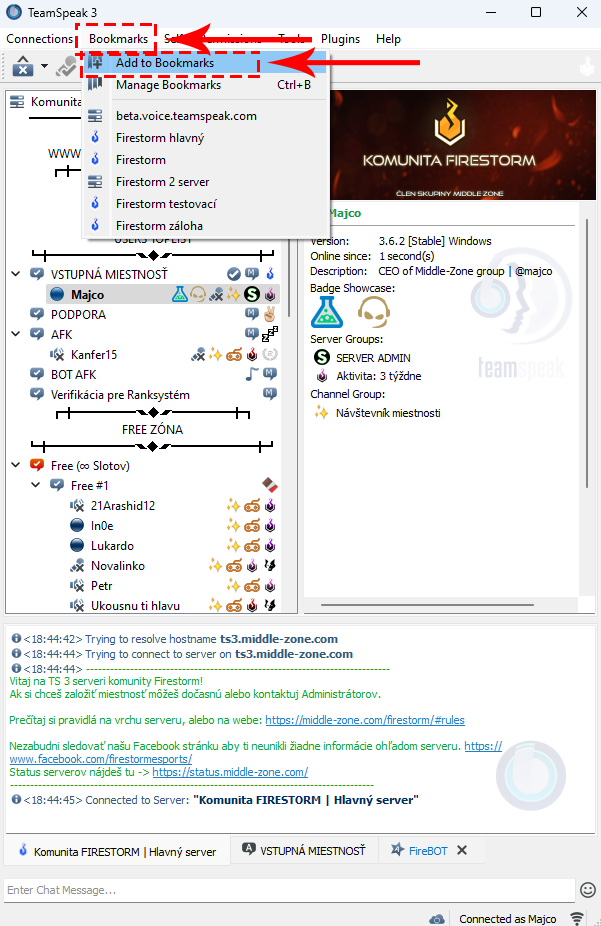 Po prvom pripojení k serveru ho odporúčame pridať do záložiek pre lepšiu orientáciu a rýchlejšie pripojenie.